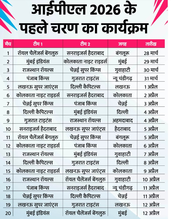 नई दिल्ली भारतीय क्रिकेट कंट्रोल बोर्ड ने इंडियन प्रीमियर लीग के 19वें सीजन के पहले चरण का कार्यक्रम जारी कर दिया है। दुनिया की सबसे लोकप्रिय टी20 लीग आईपीएल 2026 का आगाज 28 मार्च से होगा, जबकि पहले चरण के मुकाबले 12 अप्रैल तक खेले जाएंगे। इस दौरान देश के अलग-अलग शहरों में कुल 20 मैच खेले जाएंगे और कई हाई-वोल्टेज मुकाबले देखने को मिलेंगे।