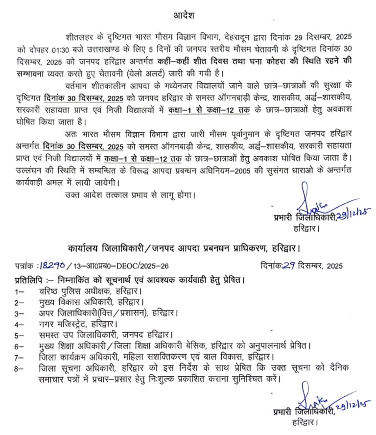 हरिद्वार। शीतलहर के दृष्टिगत जनपद हरिद्वार में नर्सरी से कक्षा 12 तक तक समस्त विद्यालय कल बंद रहेंगे। प्रभारी जिलाधिकारी के मुताबिक आदेश का उल्लंघन करने पर प्रभावी कार्रवाई अमल में लाई जाएगी।
