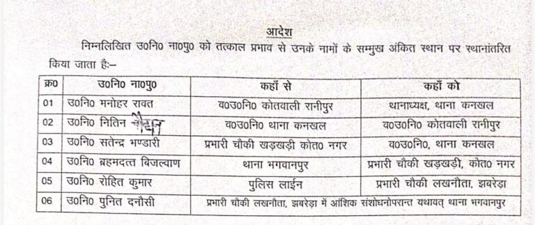 हरिद्वार। एसएसपी हरिद्वार ने देर रात कनखल थाना प्रभारी इंस्पेक्टर रविंद्र शाह को लाइन हाजिर कर दिया। उनकी जगह रानीपुर कोतवाली के वरिष्ठ उप निरीक्षक मनोहर रावत को कनखल थानाध्यक्ष बनाया गया है। जबकि वरिष्ठ उप निरीक्षक नितिन चौहान को रानीपुर कोतवाली का वरिष्ठ उपनिरीक्षक बनाकर भेजा गया है। खड़खड़ी चौकी प्रभारी सतेंद्र भंडारी को कनखल का एसएसआई बनाया गया है।